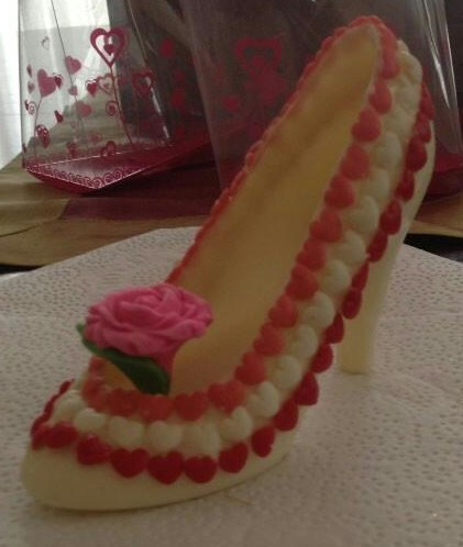 Hermoso zapato de chocolate blanco con corazones de azucar color rojo, blanco y rosado